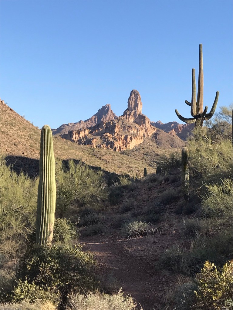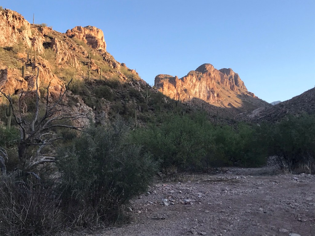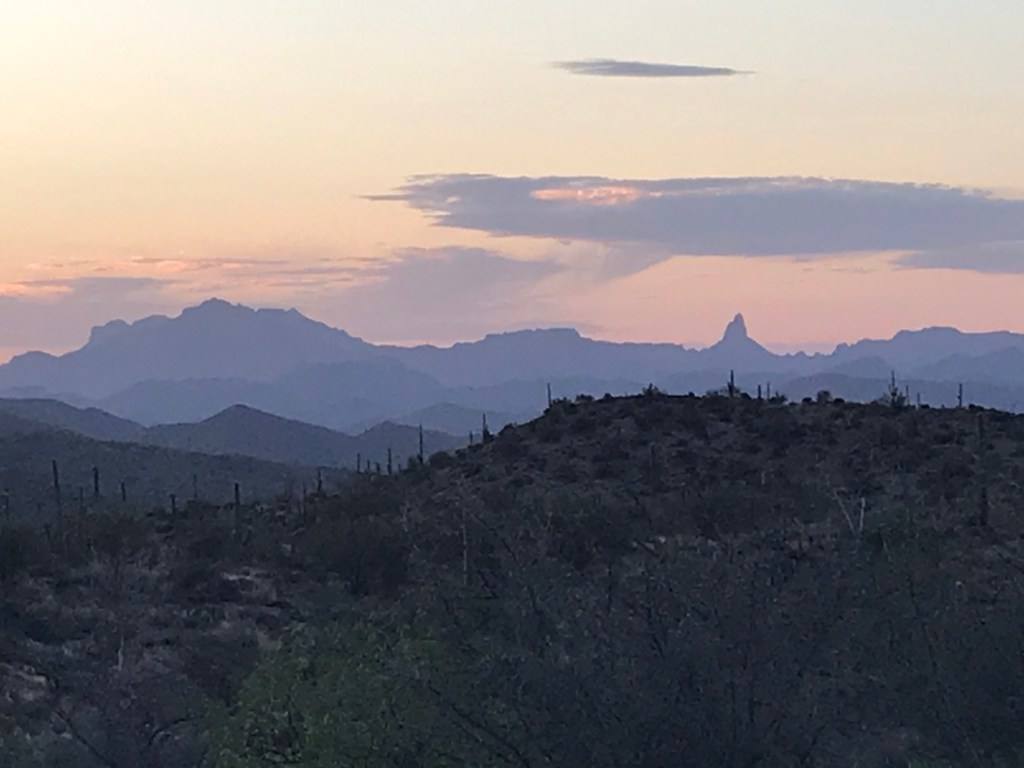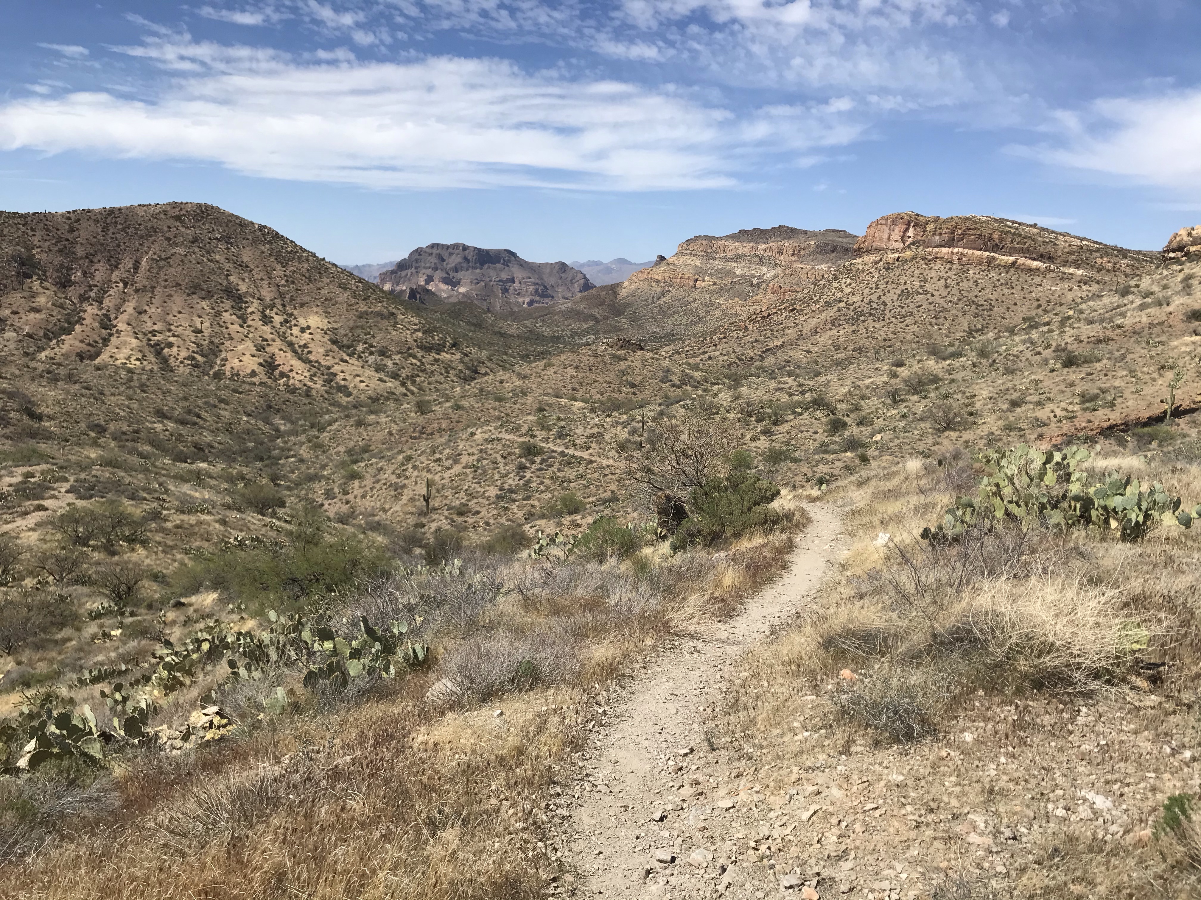 The climb up and away from the Gila River was fantastic. For several miles the route climbs in and around several interesting rock formations. For miles, off in the distance, we could see an unusual shaped structure on the top of a hill. The building looked like a giant funnel sitting on top of a large cylinder. As we huffed up the last 100 yards we could see more clearly that the structure was a rain collector that has been provided by the Arizona Trail Association(ATA). Not only was there crystal clear water that flowed from a spigot, there was also a nice little sliver of shade next to the rain collector. It was really impressive to see the lengths that the ATA has gone through to ensure water along this dry stretch of trail. Thank you!